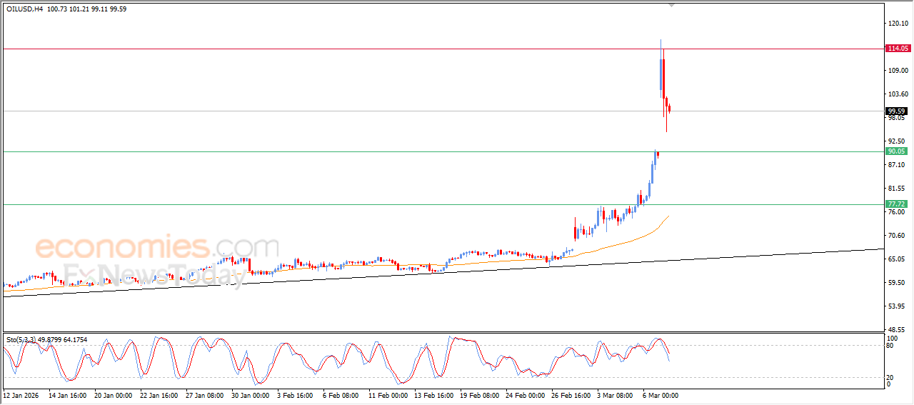 Le prix du pétrole brut a reculé en fin de séance, après avoir atteint notre objectif matinal de résistance à 114,00 $, afin de consolider ses gains et de tenter de trouver un plus bas plus élevé qui pourrait lui insuffler une dynamique haussière et favoriser sa reprise. Le prix cherche à se délester de sa situation de surachat, comme l'indiquent les indicateurs de force relative, notamment avec l'apparition de signaux négatifs, malgré la domination de la tendance haussière principale à court terme.