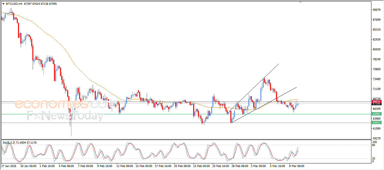 Le cours du BTCUSD a progressé lors de sa dernière séance de négociation intraday, testant à nouveau la résistance clé à 68 000 $, et atteignant la résistance de la moyenne mobile exponentielle à 50 ans (EMA50). Cette hausse a été soutenue par l’apparition de signaux positifs provenant des indicateurs de force de résistance, indiquant un ralentissement rapide de la dynamique haussière, affectée par une formation technique négative à court terme représentée par le biseau ascendant.