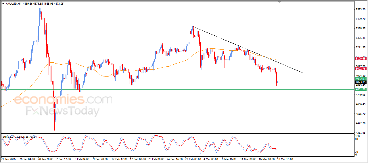 Le cours de l'or a reculé lors de sa dernière séance de bourse, franchissant le seuil de support psychologique des 5 000 $, sous la pression baissière persistante due à son passage sous la moyenne mobile exponentielle à 50 jours (EMA50), ce qui l'a conduit à casser le support des 4 900 $. Ce support était un objectif anticipé dans notre analyse précédente, la pression baissière se poursuivant en raison des signaux négatifs des indicateurs de force relative, dans un contexte de tendance baissière mineure dominante à court terme.