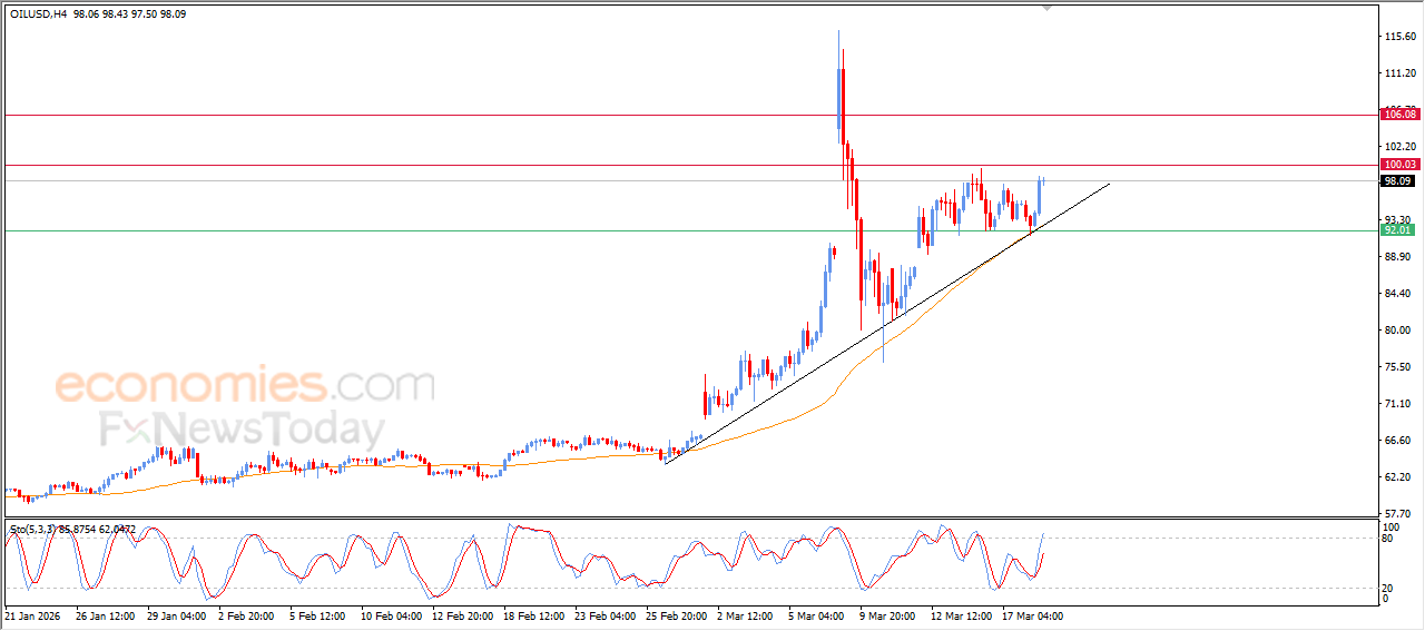 Le prix (du pétrole brut) a augmenté lors de sa dernière séance de négociation intraday, dans un contexte de domination de la tendance haussière principale et de négociation le long de la ligne de tendance de soutien mineure, avec la poursuite de la pression positive qui provient de sa négociation au-dessus de l'EMA50, outre l'apparition de signaux positifs des indicateurs de force relative.