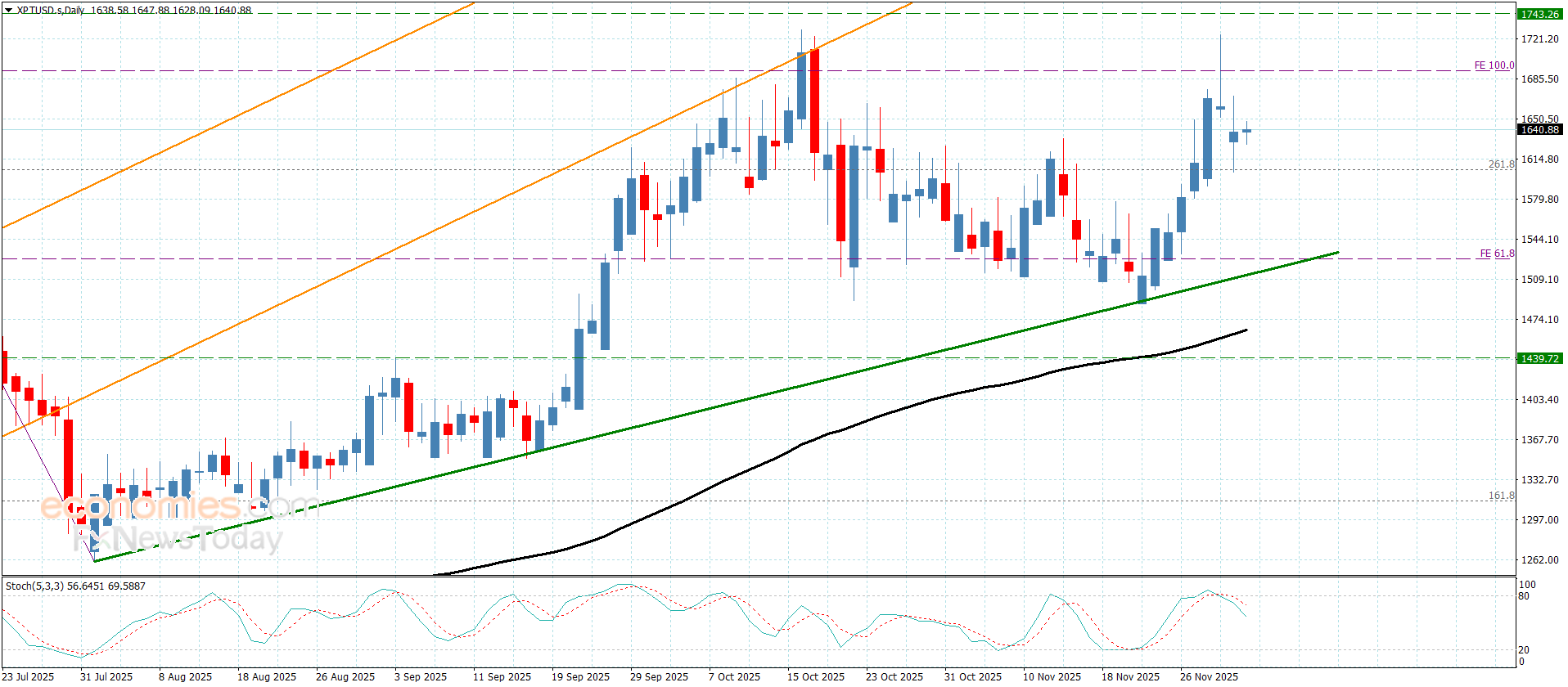Le cours du platine a maintenu sa stabilité positive hier au-dessus de 1 605,00 $ , qui constitue actuellement un support supplémentaire. Ceci confirme la tendance haussière précédemment observée, le cours fluctuant autour de 1 640,00 $ .