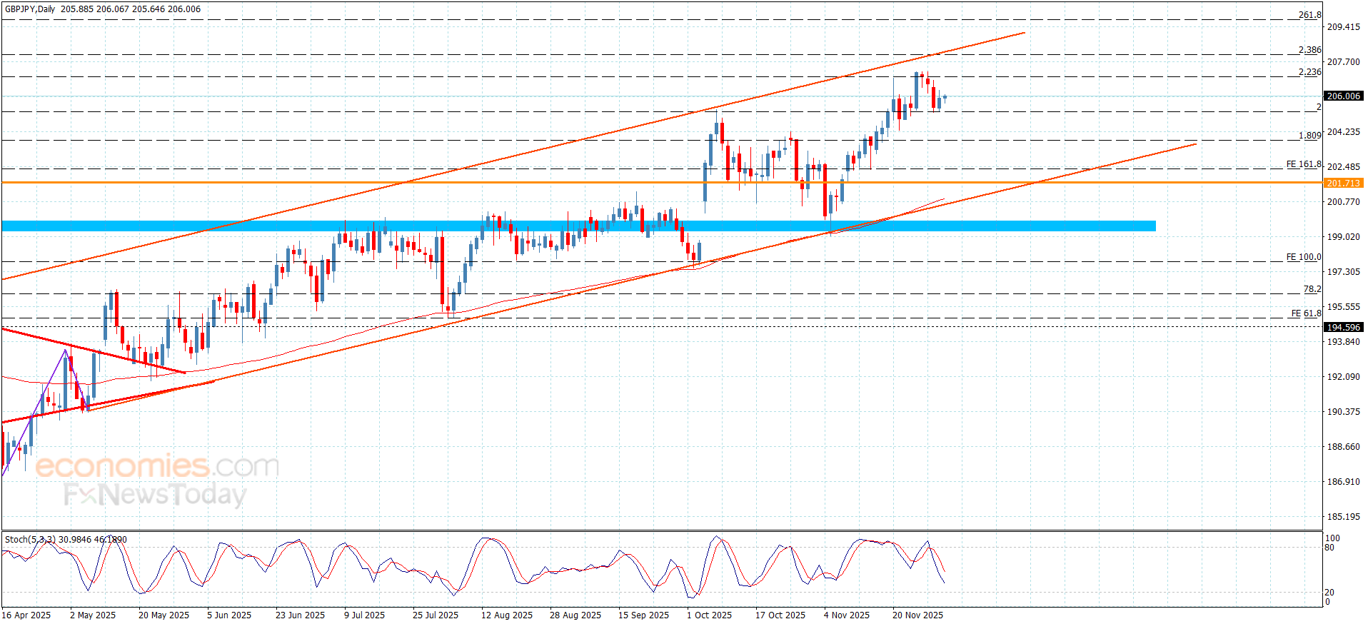 Bien que la paire ait récemment manqué de dynamique haussière, sa stabilité positive répétée au-dessus du niveau de support supplémentaire à 205,25 renforce les chances de formation de nouvelles vagues haussières. On observe désormais son approche du premier objectif mentionné dans le rapport précédent, situé à 206,35 .