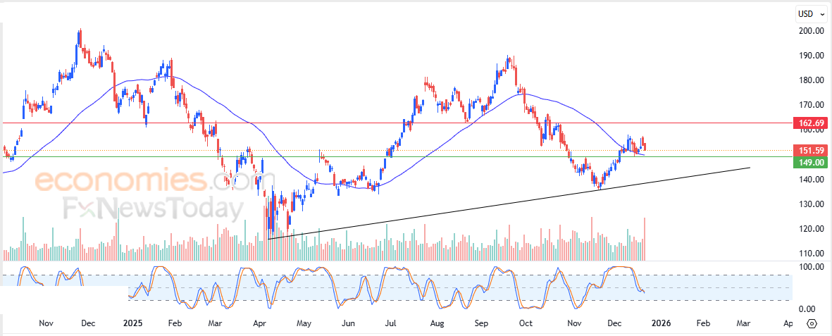 Par conséquent, nous prévoyons une hausse du cours de l'action lors de sa prochaine séance, à condition que le niveau de support à 149,00 $ se maintienne, avec pour objectif le niveau de résistance à 162,70 $.